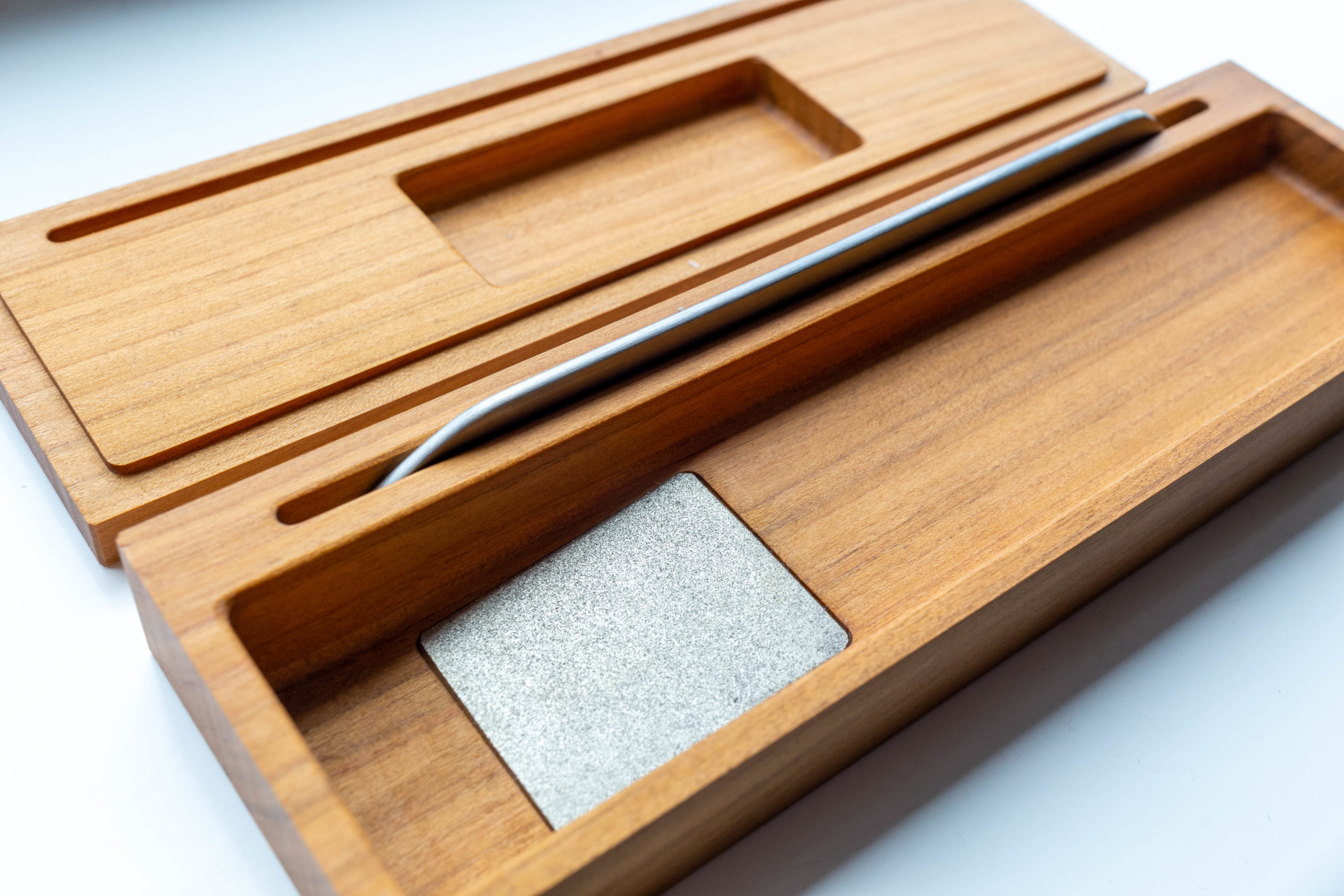 The end of the case near the ‘sandpaper’ (more about that in my video) is lowered to create a nice angle when you use the ‘sandpaper’ and to hold pencil shavings if necessary.