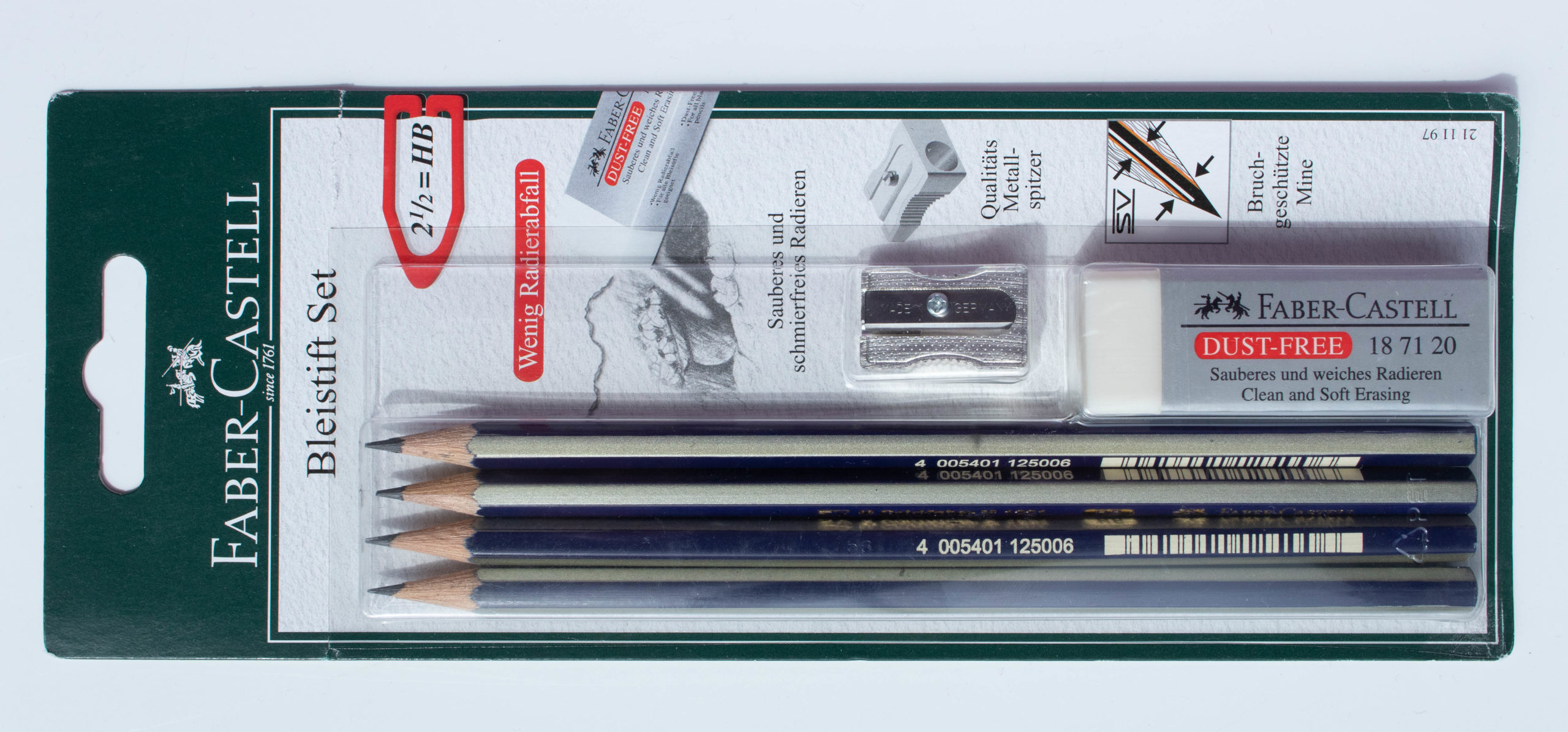 The Goldfaber 1221 pencil is a nice writer. It is HB but writes darker than a Castell 9000 in B. I am not surprised though – I always found the 9000 to be lighter than similar grades in other pencils. Pearson’s Graphite 2015 confirms this, the Goldfaber HB is listed with a darkness of 12, the Castell 9000 B with a darkness of 8 [4]higher value = darker. The wood being used in the Goldfaber is also very good. For the price you pay the quality is excellent, but it can’t compete with high-end pencils from Faber-Castell or other brands. Out of the four pencils from the set one is slightly bent, two could have a better centred lead and all four don’t have a perfect paintjob. These small shortcomings don’t detract from the positive impression left by the dark graphite and the nice wood, especially not at this price [5]Eraser and sharpener are approximately half the value of the £4.50. There was also a faint smell of paint when the Goldfabers were fresh out of the box, something Faber-Castell’s Castell 9000 with its water-based varnish doesn’t suffer from, but the smell disappeared after a while.