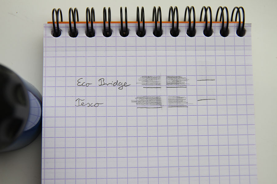 Eco Bridge & Tesco on Bloc Rhodia No 13, eraser test with Mars plastic pen, smudge test on the right