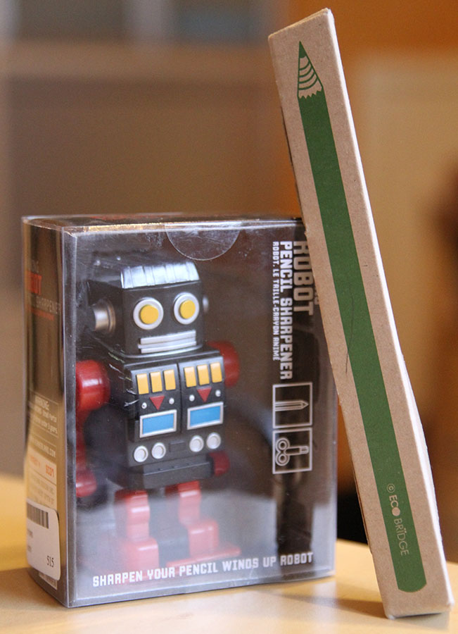 Last time I visited Selfridges, they had the Robot Pencil Sharpener from Kikkerland on a shelf. I recognised it from Dave’s Mechnical Pencils, but I am sure I have also seen it in other blogs. Of course I could not resist and was drawn to it. Next to it there were also some other novelty pencils and eraser, including big dinosaur shaped erasers, Penguin Book pencils and paper pencils. This being Selfridges the items were not cheap, but I still bought the robot sharpener and the paper pencils.