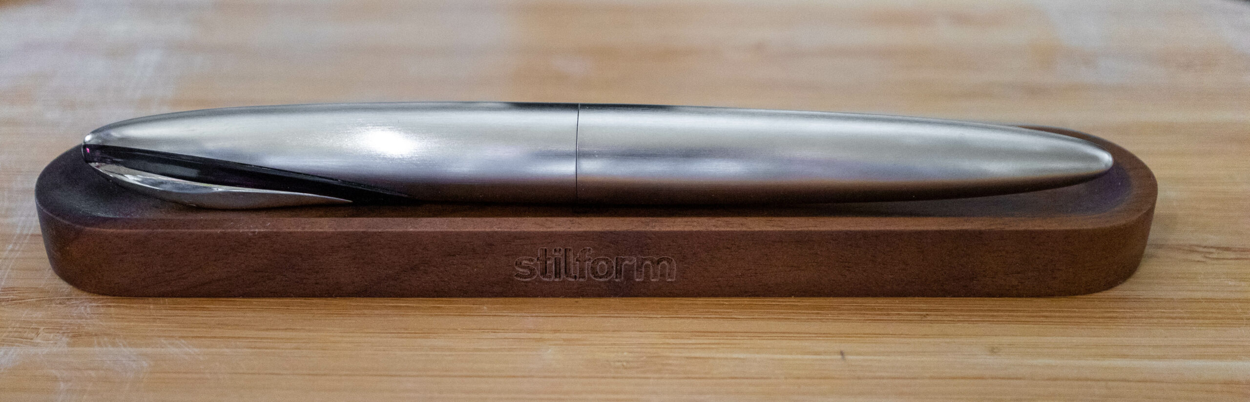 If I want to simplify an explanation of what Stilform does I would boil it down to the following: Stilform uses Kickstarter to finance the production of pens made from Aluminium. These pens use a magnetic mechanism to hold the cap in place, similar to the one made popular by the Montblanc M. They are nice but a bit chunky, with a choice of (Bock) nibs. Their fountain pens don’t contain glue or plastic. I bought some of their accessories and my favourite, with a permanent space in front of my monitor, is their wooden pen holder, a bit like a pen tray for one pen.