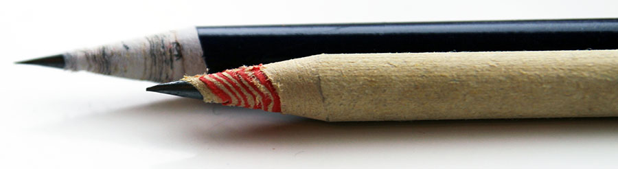 When it comes to sharpening the pencils the Tesco pencil performs better than the Eco Bridge. The blade of the sharpener (in this case the Eisen 402) seems to cut the Tesco paper much better, while the paper in the Eco Bridge is more likely to get ripped away. While the paper used for the Tesco pencil is rolled paper with Chinese characters on it, probably from a newspaper or something similar, all three Eco Bridge pencils have a similar colour distribution on the paper, red in the middle, near the lead, and recycling beige on the outside. I suspect that the paper used for the Eco Bridge has been recycled and printed on specifically for this pencil, in order to produce this pattern on the paper. This would also explain the higher price tag. This recycling process might be responsible for the rougher paper, compared to the Tesco pencil, which results in the paper ripping easier.