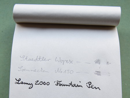 The Memo Pad (item code 1476353) has 200 sheets and is made from 50% recycled paper [1]At least according to the information provided by Muji. In the previous years there have been some concerns about the accuracy of the figures given by the manufacturers as several large Japanese … Continue reading. As expected the recycled paper is not pure white. The colour of the paper from my memo pad is slightly more green than other recycled paper I know, but this might not apply to all Memo Pads. Writing on it with a pencil is working really well. Writing on it with a fountain pen is a very different thing though. It is actually quite problematic as the paper soak the ink up really fast. Enhanced difficulty – I used a really wet writer: the Lamy 2000 fountain pen and tried to use it on this paper, but writing very fast and with few pressure. It didn’t really work well either (as you can see). If you want to use this paper with a fountain pen (even if it not such a wet one) you will have to live with the fact that you can also see the ink on the reverse of the sheets.