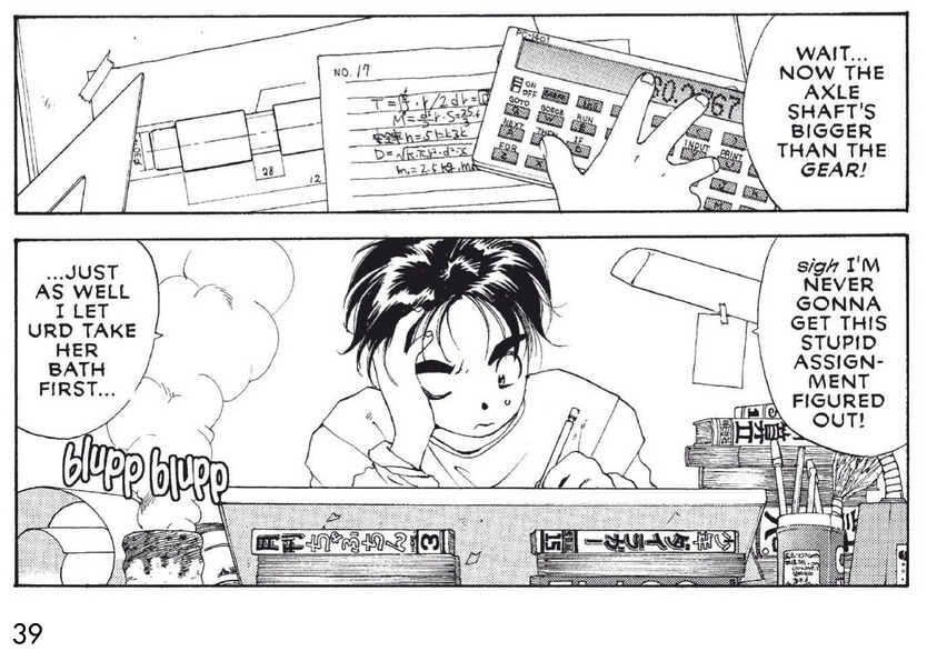 Keiichi using a Sharp PC-1401 calculator/computer and a so far unidentified mechanical pencil (Oh My Goddess #5, p.39, read right to left)